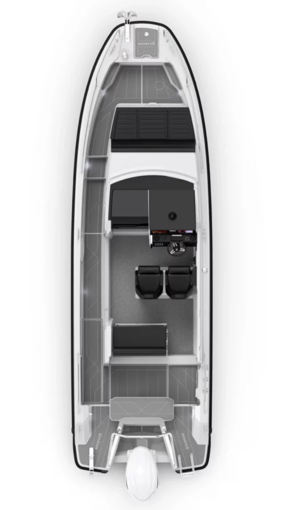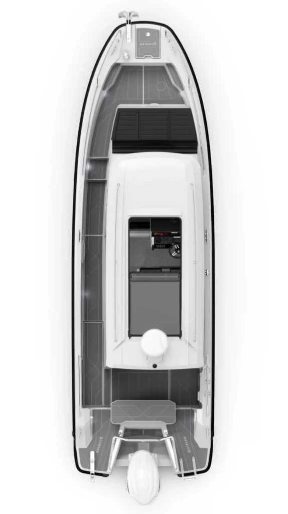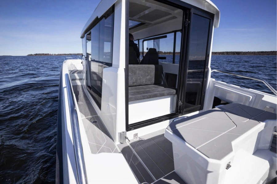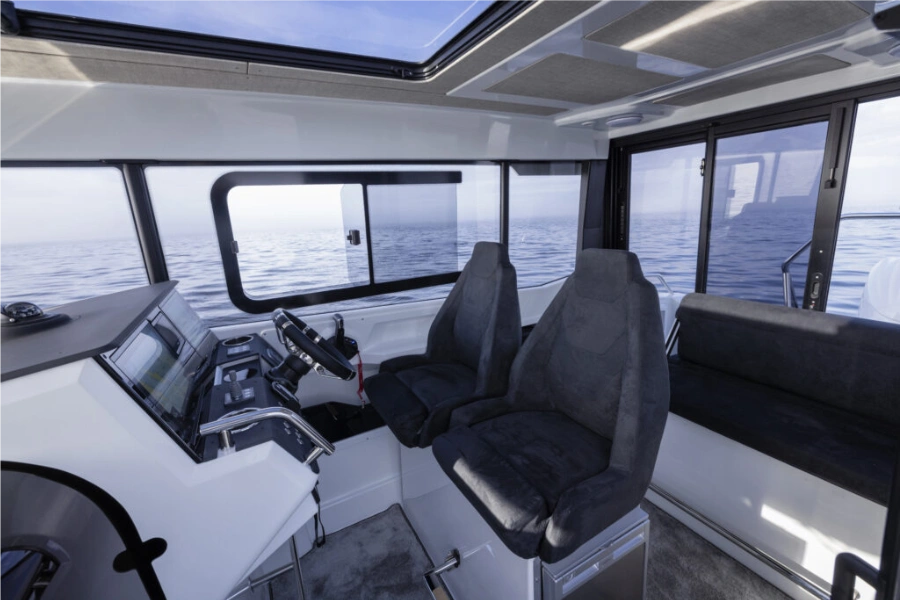 One of the defining features of the Quarken 27 Cabin is its enclosed panoramic wheelhouse. Large windows draw in natural light while shielding passengers from wind, rain, and cooler temperatures. Consequently, the boat extends the Canadian boating season and allows owners to cruise comfortably in early spring and late fall. At the same time, sliding doors and opening sections maintain airflow during warm summer days.