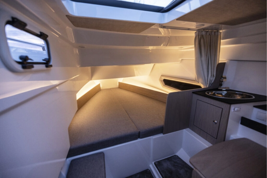 The layout maximizes usable space without sacrificing comfort. Forward seating transitions smoothly into the helm area, creating a social yet functional cockpit. Meanwhile, a wide walkway improves safety and accessibility when moving around the vessel. Because of its thoughtful proportions, the 27 Cabin feels larger than its length suggests.
