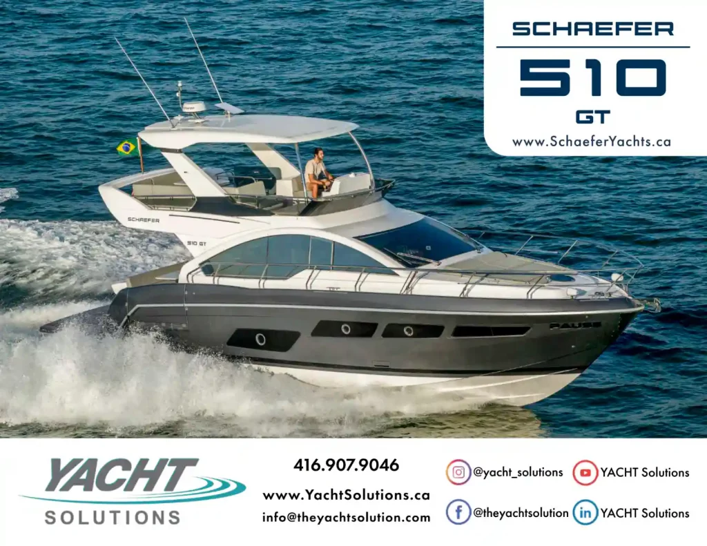 The Schaefer 510 GT blends luxury design with performance, featuring sophisticated styling and expansive indoor-outdoor living spaces. Built for those seeking comfort and presence on the water, it delivers a premium cruising experience in every detail. Explore the Schaefer 510 GT for sale in Toronto through YACHT Solutions.
